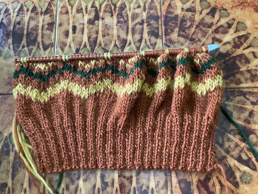 If it inspires you to get going, here’s how far I got with the back in January. I knitted along to one movie, a couple of TV shows and did a few rows with my morning coffee a couple of days. Little by little, we will fill the world with Jessica Fletcher Fish Jumpers!