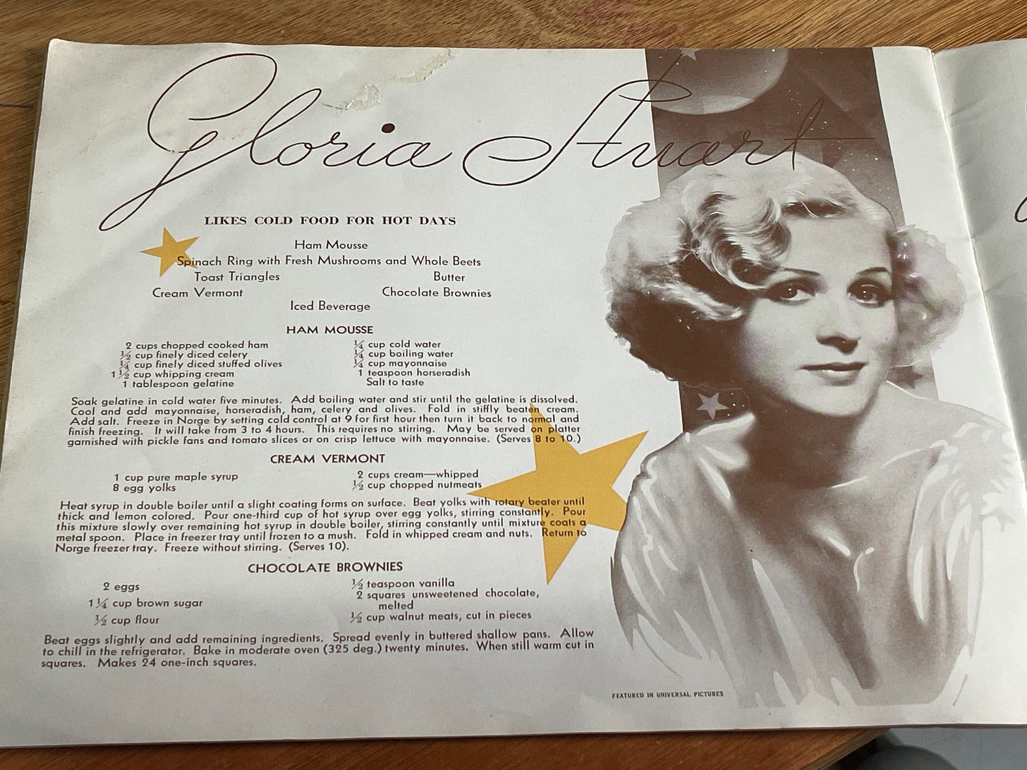 I’m sharing a pic of Gloria’s original recipe here as it appears in one of my very favourite movie star recipe collections. It is a thing of great beauty, a 1930s pamphlet promoting Norge refrigerators, maybe a free gift if you bought one?
